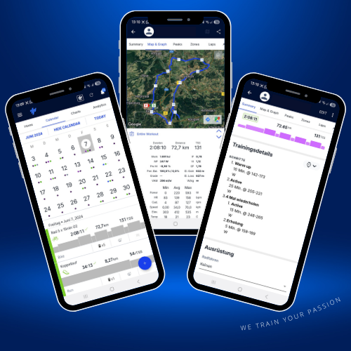 Unsere Trainingsplanung erfolgt über die Trainingsplattform von Trainingpeaks. Mit der App hast du dein Training immer bei dir, egal wo du dich gerade aufhältst. Du siehst dein geplantes Training mit Details zur Ausführung, Belastungsvorgaben (Herzfrequenz, Watt, Geschwindigkeit, gefühltes Belastungsempfinden), Trainingsvideos, uvm. Dein Training wird mit den Trainingsvorgaben automatisch an deine Smartwatch gesendet und du wirst sicher durch das Training geleitet. Nach dem Training werden deine Trainingsdaten automatisch importiert. Neben der Trainingsplanung steht insbesondere die Analyse deines absolvierten Trainings im Fokus.